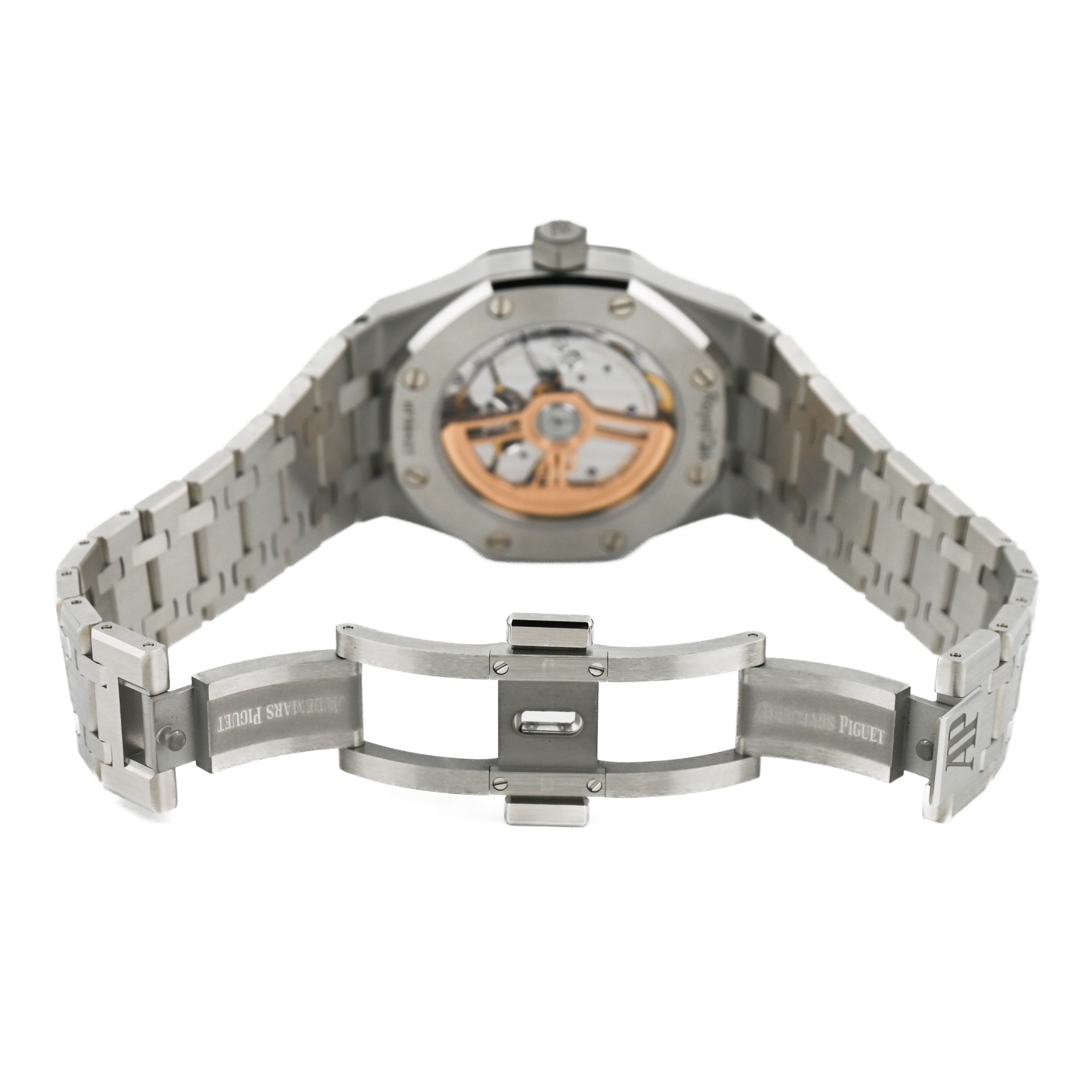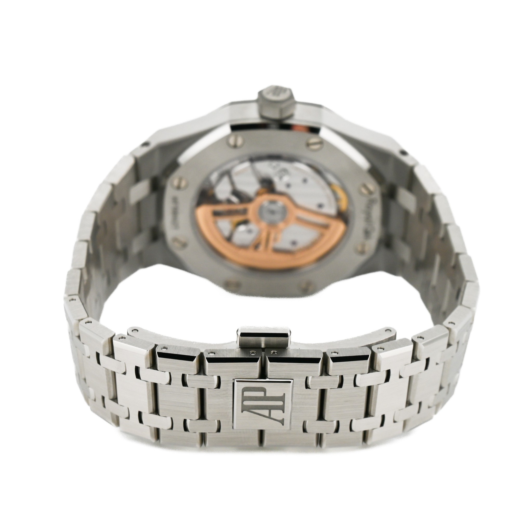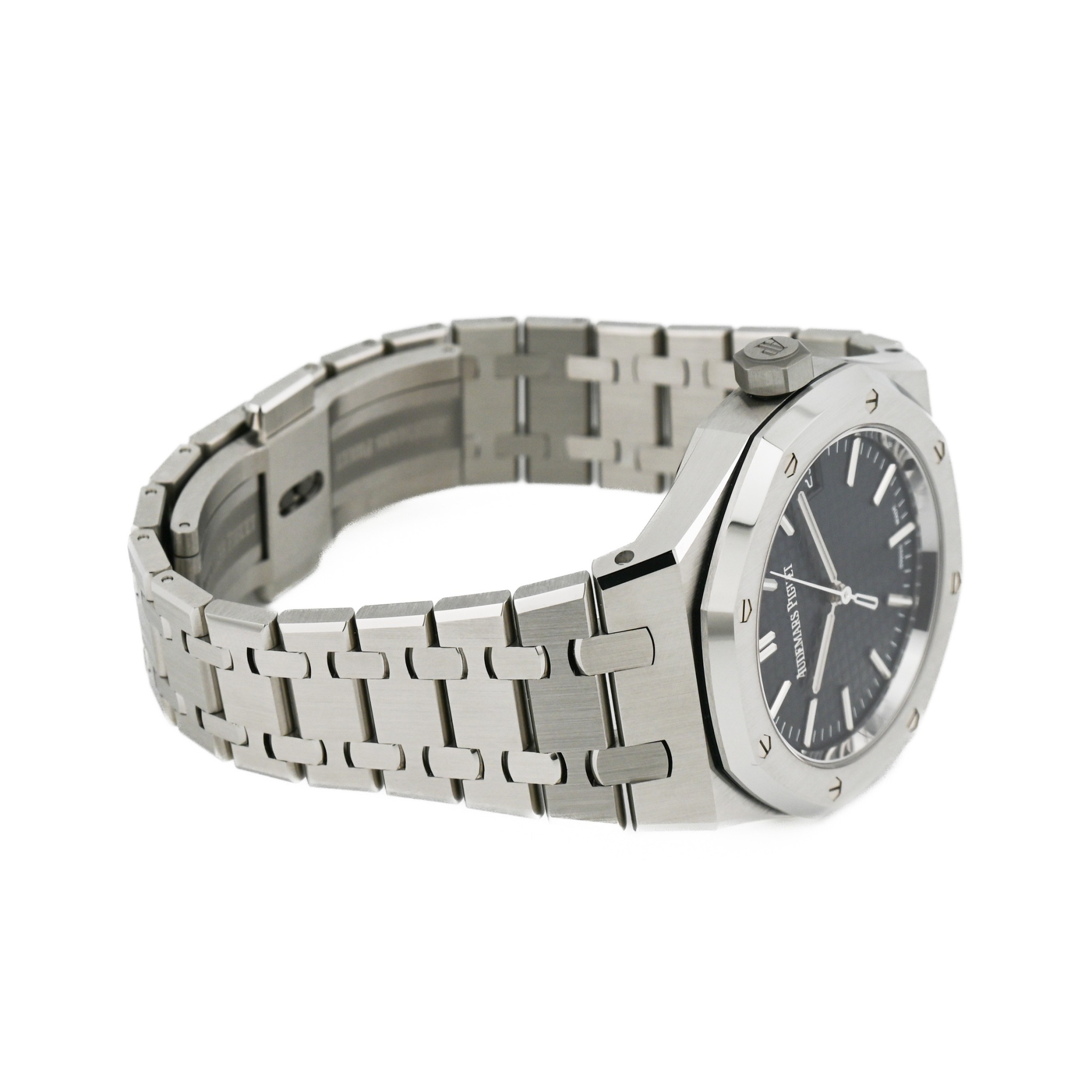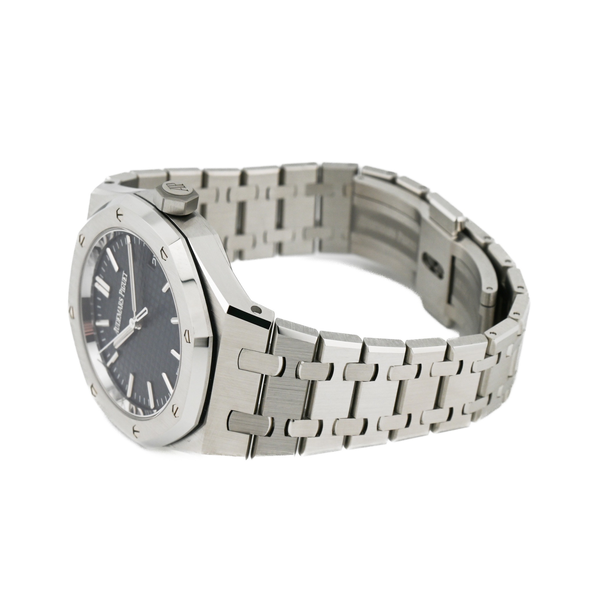 型番:15550ST.OO.1356ST.06シリーズ名:ロイヤルオーク オートマティックサイズ:37mmムーブメント:自動巻き素材:ステンレススティール文字盤:「グランドタペストリー」模様の「ナイトブルー、クラウド50」ダイヤル、蓄光処理を施したホワイトゴールドのアプライドアワーマーカーとロイヤルオーク針仕様:クロノグラフ 日付表示風防:サファイアガラス防水性:50 m防水年式:2025年