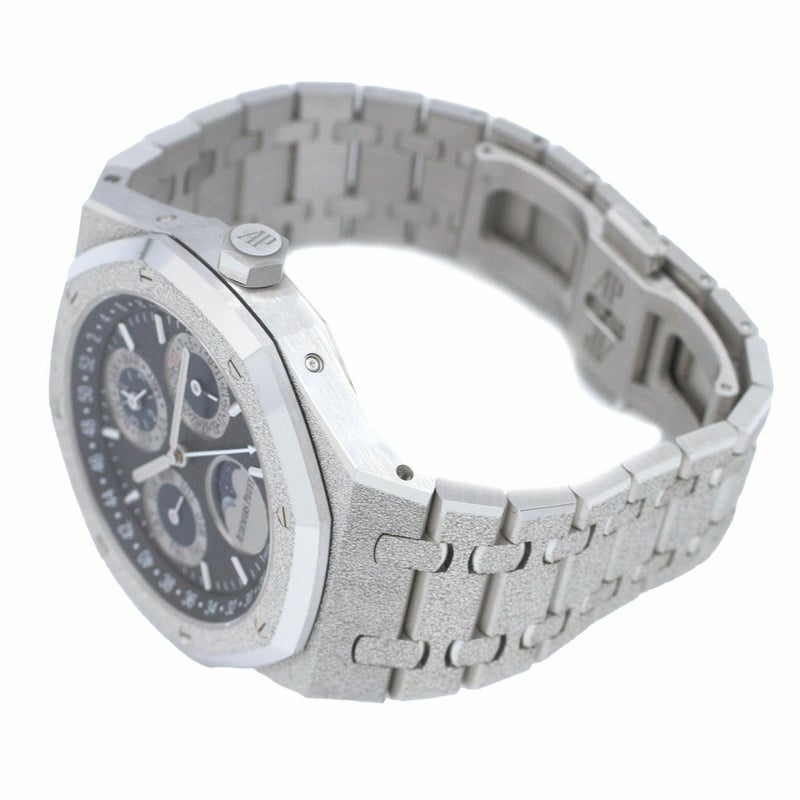 型番:26574BC.GG.1224BC.01ケース:鍛金加工による18Kホワイトゴールドべゼル:-風防:反射防止加工サファイヤガラスケースサイズ:41.0mm ケース厚:9.5mm文字盤:グランド タペストリー模様のブラックダイヤル、ブルーカウンター、ホワイト外周リング、蓄光処理を施したホワイトゴールドのアプライドアワーマーカーとロイヤルオーク針ムーブメント:自社製キャリバー5134 自動巻き パワーリザーブ:40時間 振動数:2.75Hz (19,800振動/時) 石数:38 部品数:374仕様:時・分表示 週表示つきパーペチュアルカレンダー デイデイト表示 アストロノミカルムーン 月、閏年表示 サファイアガラスバック防水性:防水性:20m防水ブレスレット:鍛金加工による18Kホワイトゴールドブレスレット、APフォールディングバックル年式:2015年