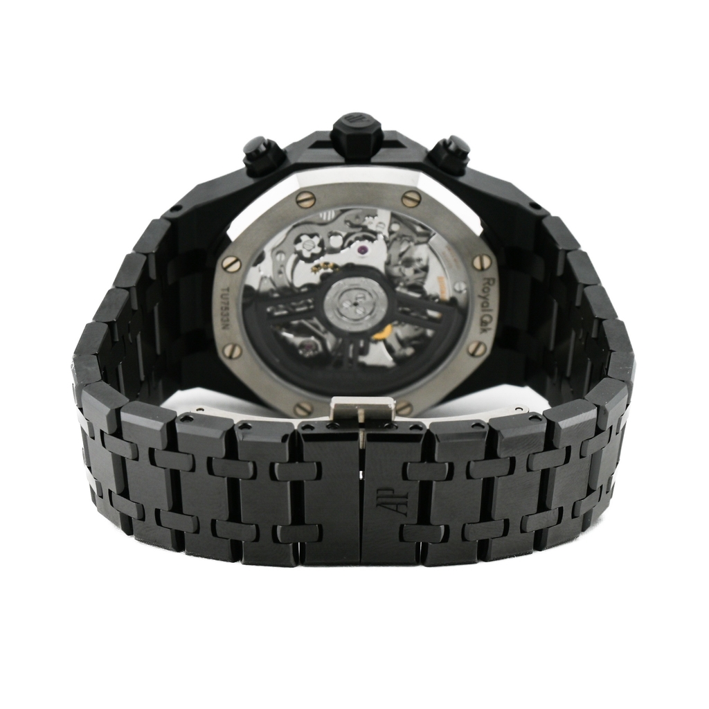 型番:26240CE.OO.1225CE.02サイズ:41.0mmムーブメント:自動巻き素材:ブラックセラミック文字盤:「グランドタペストリー」模様のブラックダイヤル、ブラックカウンター、蓄光処理を施したピンクゴールドのアプライドアワーマーカーとロイヤルオーク針仕様:フライバッククロノグラフ日付表示風防:サファイアガラス防水性:50m防水年式:2025年