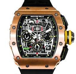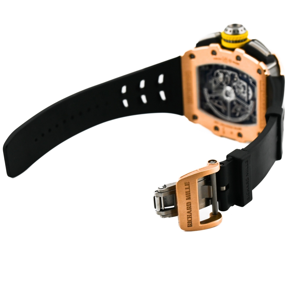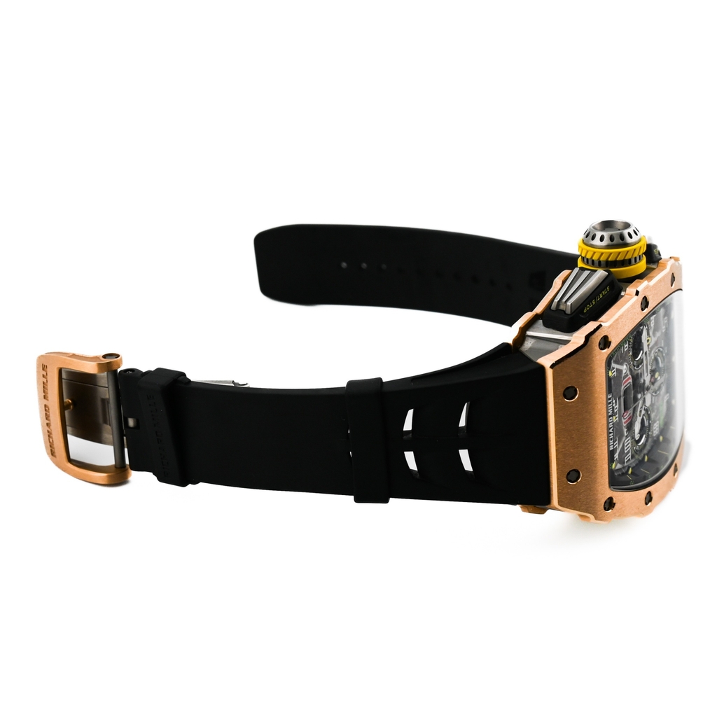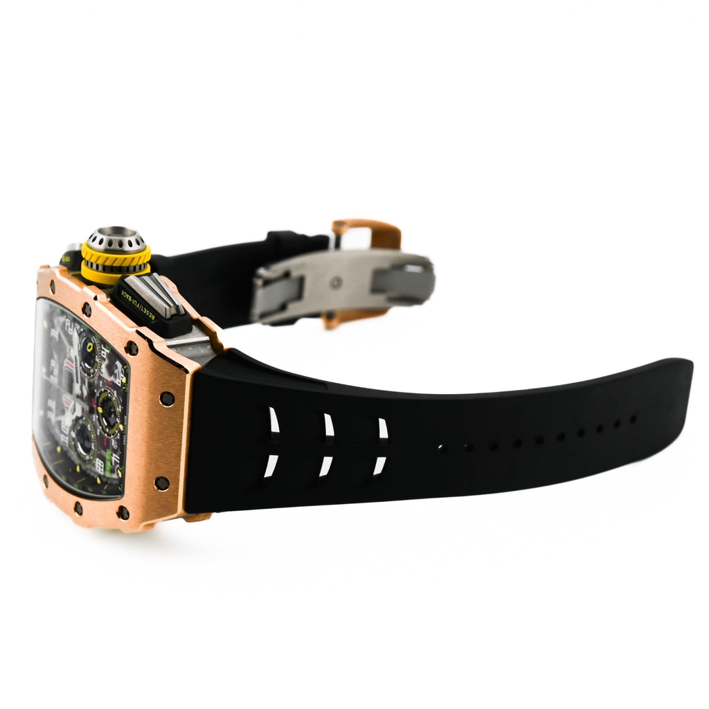 型番:RM11-03 RG TIサイズ:44.50mm x 49.94mmムーブメント:自動巻き素材:ローズゴールド×チタン文字盤:スケルトン仕様:アニュアルカレンダー フライバッククロノグラフ風防: サファイアガラス防水性:50m防水年式:2018年