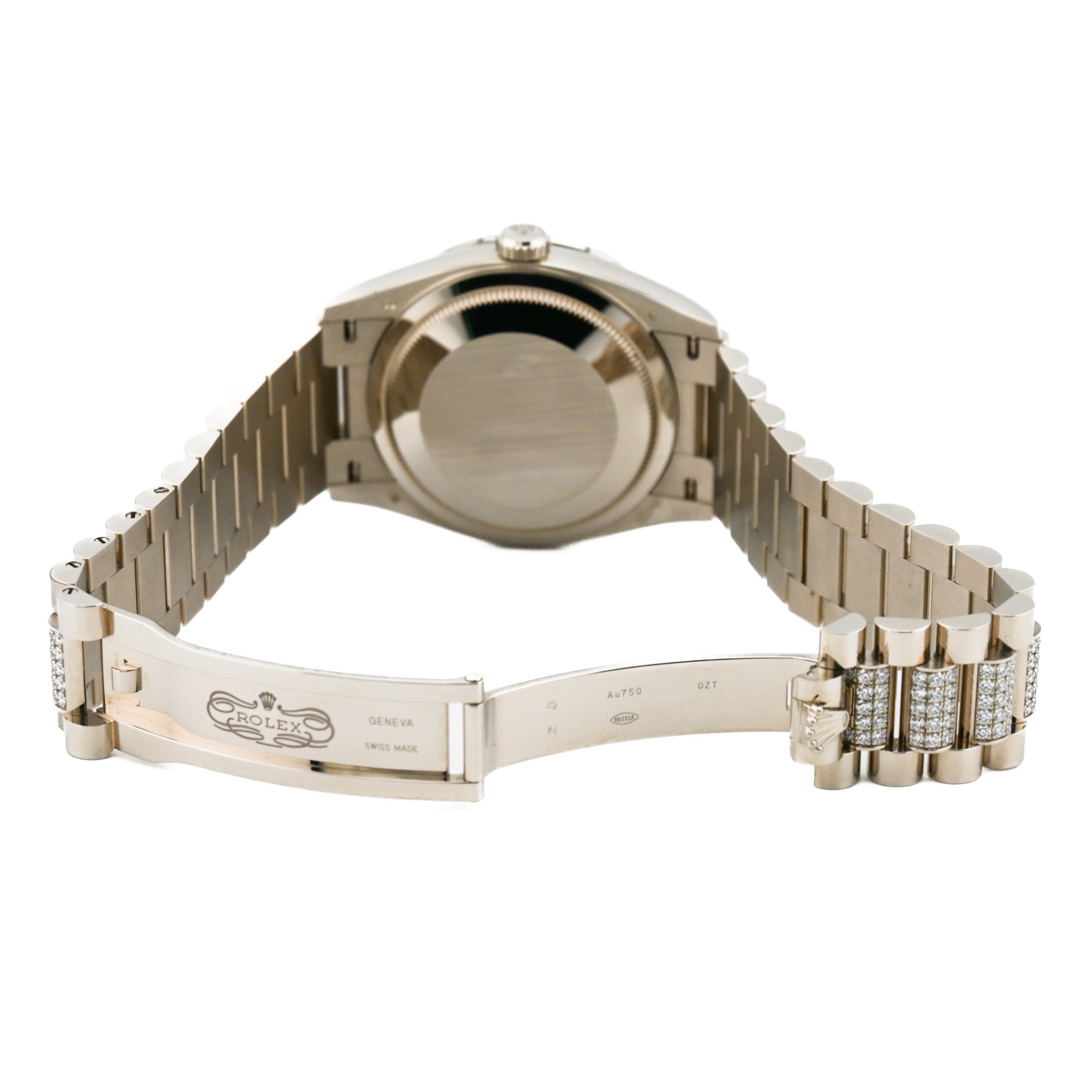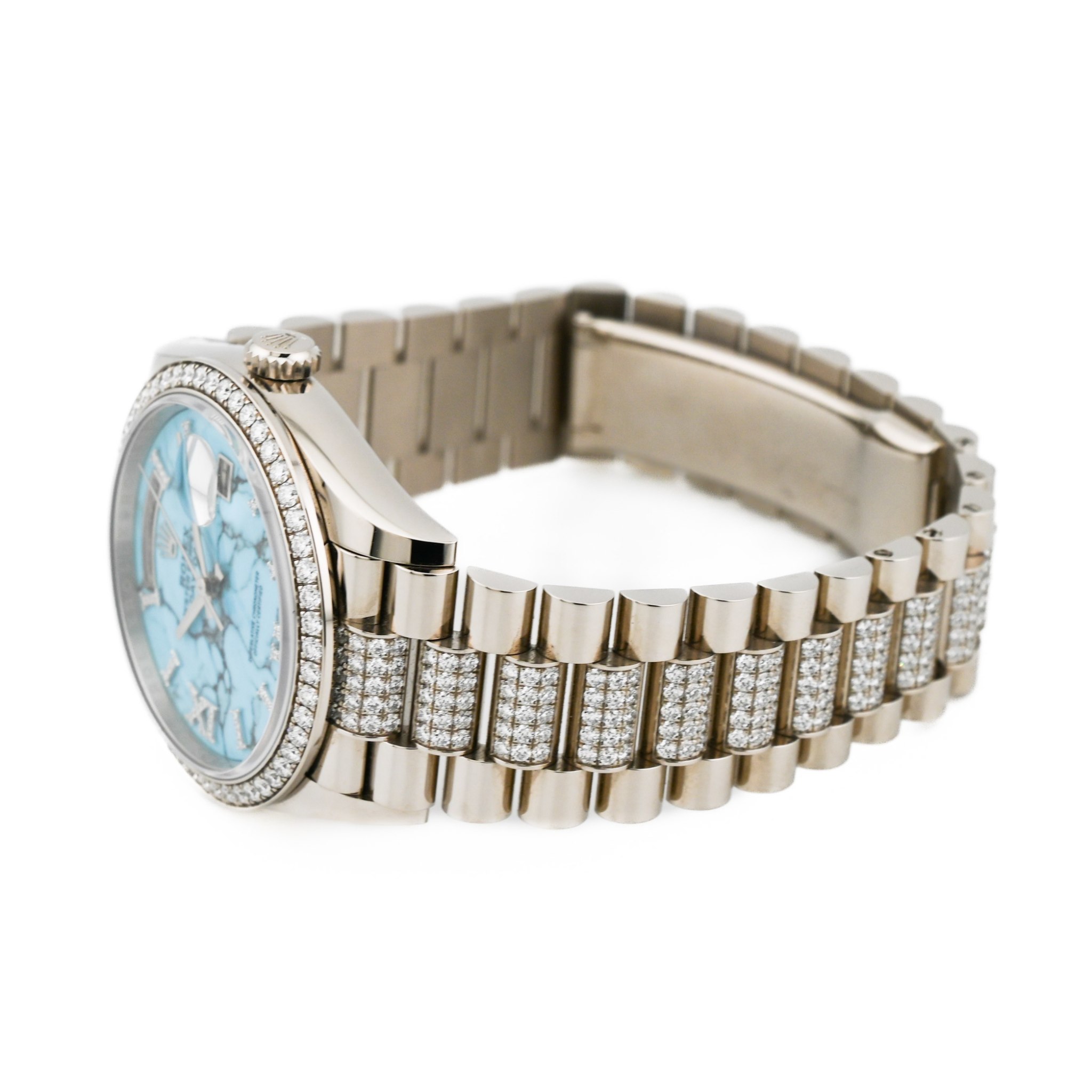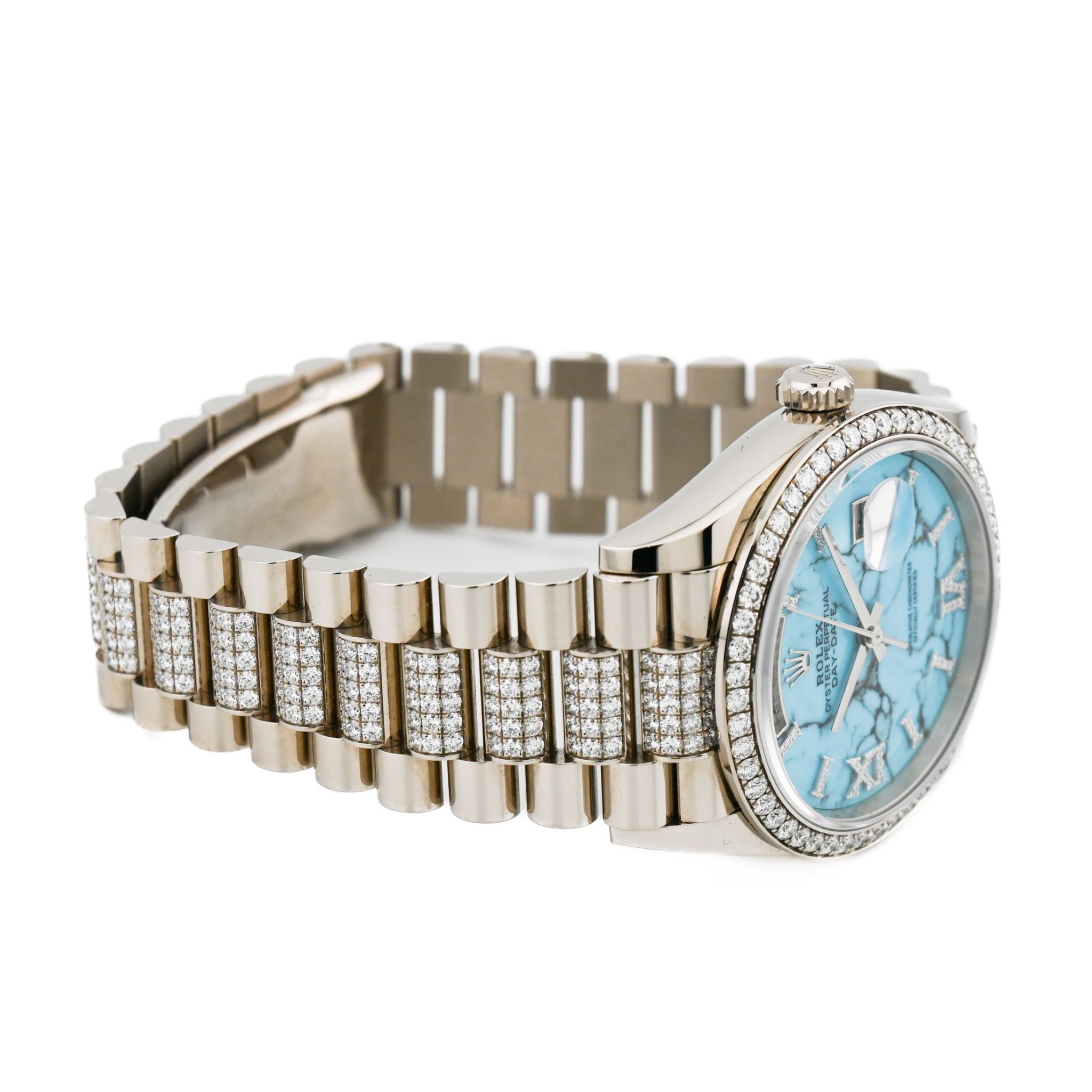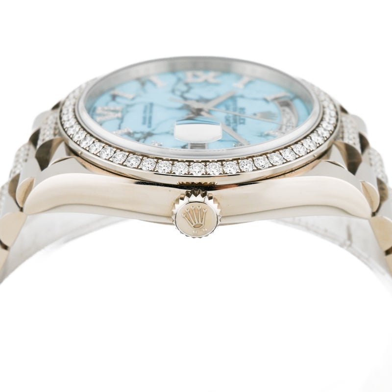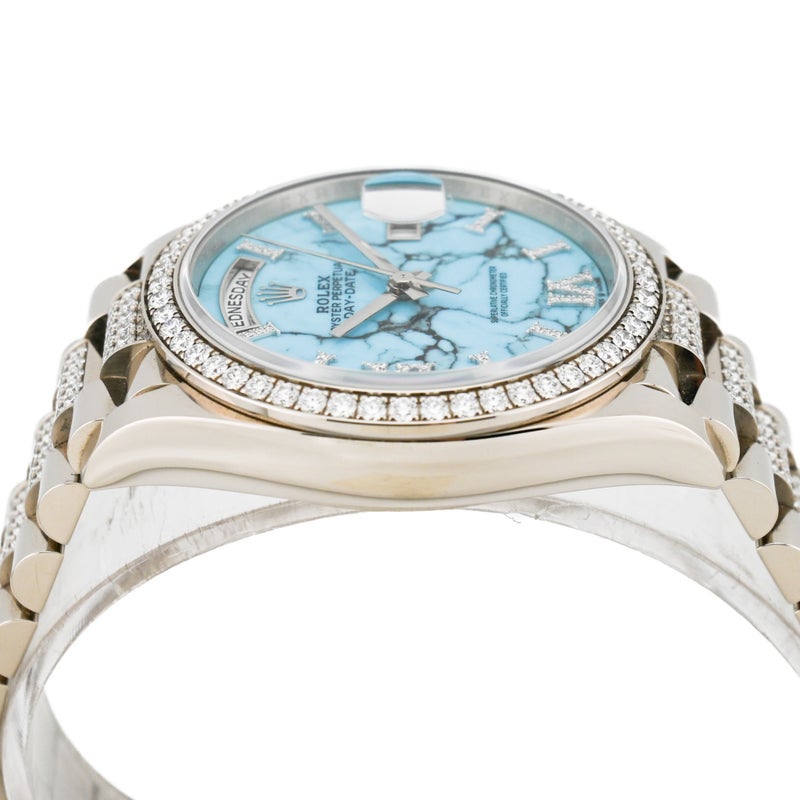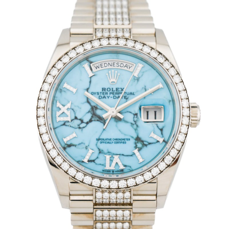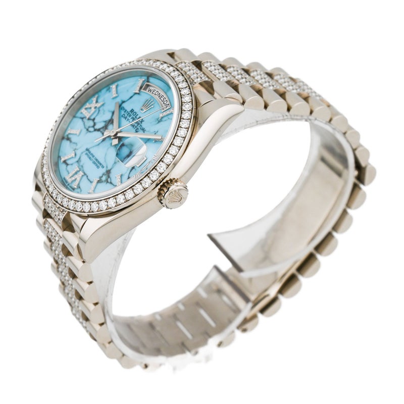 型番:128349RBRシリーズ名:デイデイト〔廃盤品〕サイズ:40mmムーブメント:自動巻き素材:ホワイトゴールド/ダイヤモンド文字盤:ターコイズ仕様:日付表示風防:サファイアガラス防水性:防水 10 ATM 年式:2026年
