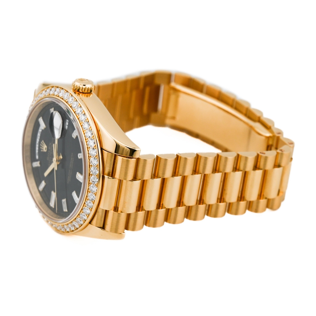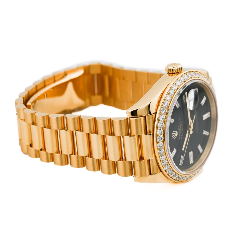型番:228348RBRサイズ:40mmムーブメント:自動巻き素材:イエローゴールド/ダイヤモンド文字盤:ブライトブラック仕様:日付表示風防:サファイアガラス機能:クロノグラフ防水性:100m防水年式:2018年