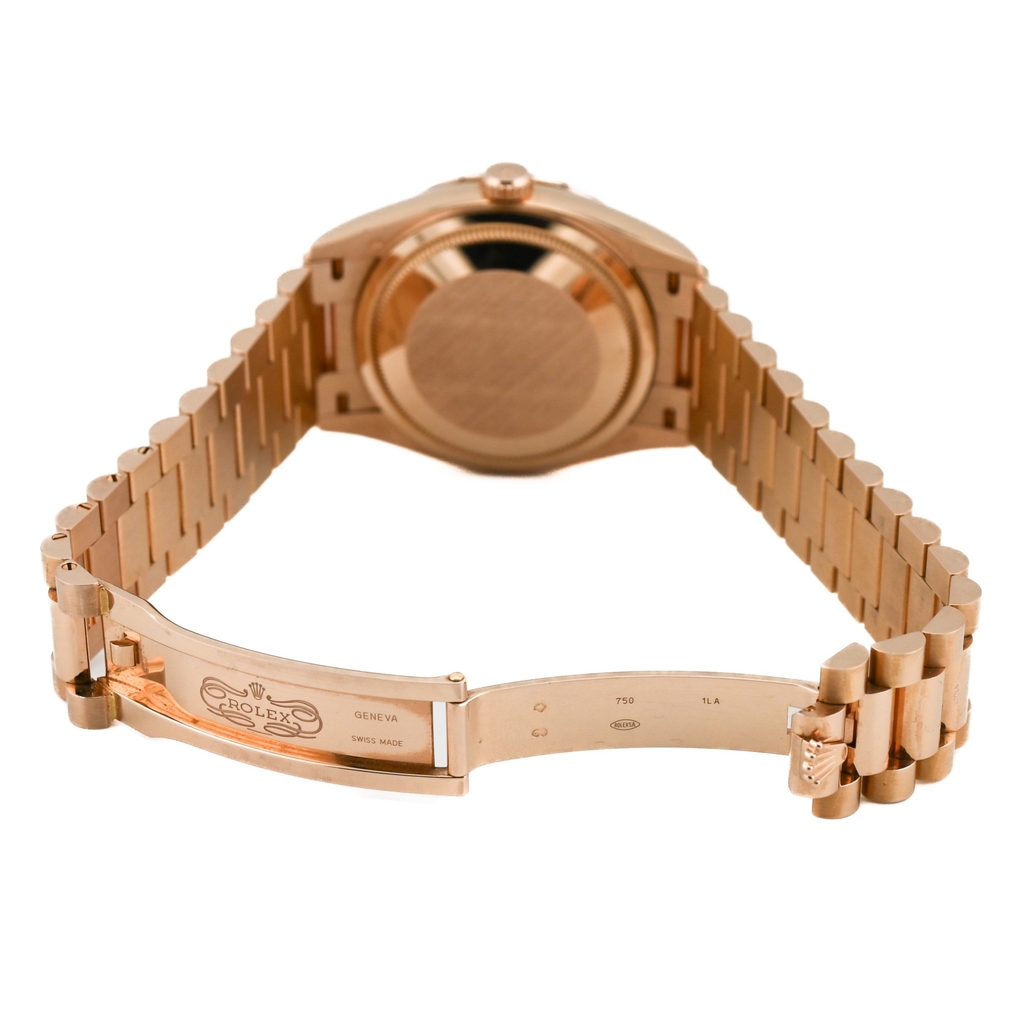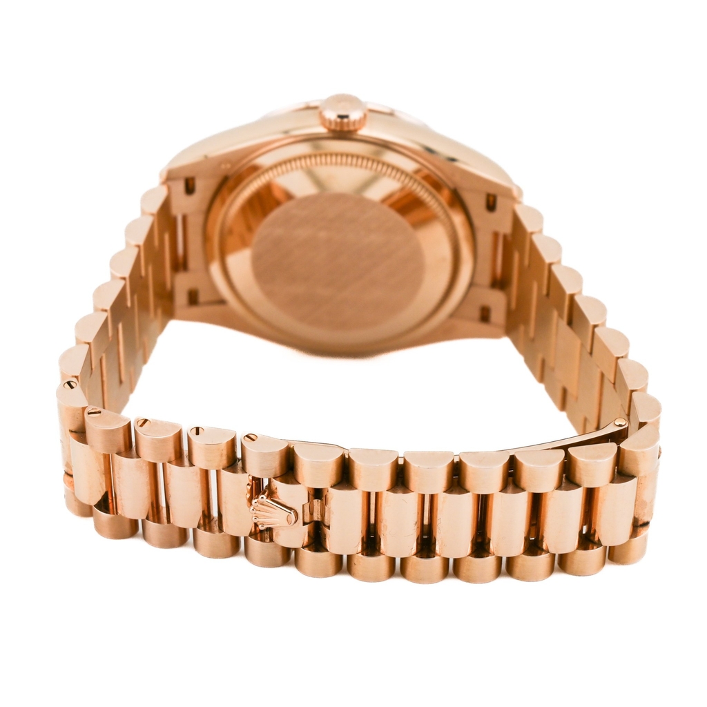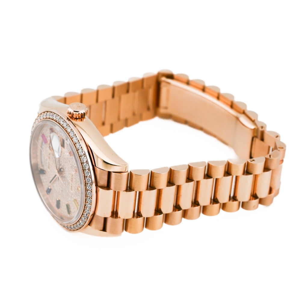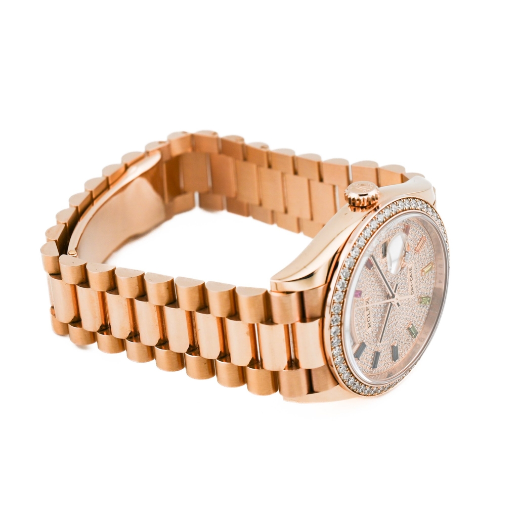 型番:128345RBRシリーズ名:デイデイト 36サイズ:36mmムーブメント:自動巻き素材:ピンクゴールド / ダイヤモンド文字盤:ダイヤモンド/10Pカラーダイヤ仕様:デイデイト表示風防: サファイアガラス防水性:防水 10 ATM年式:2020年
